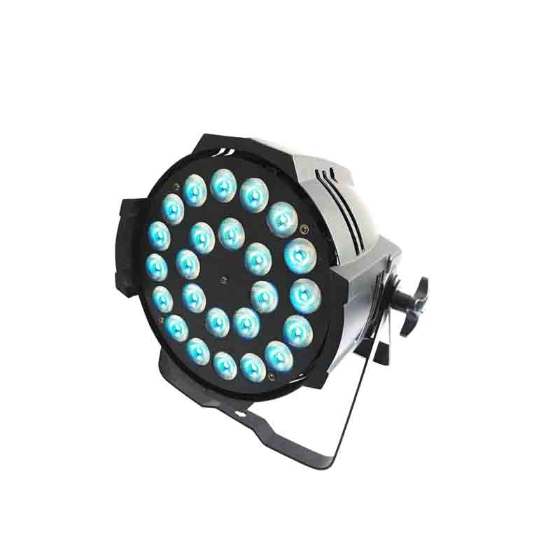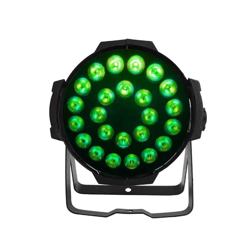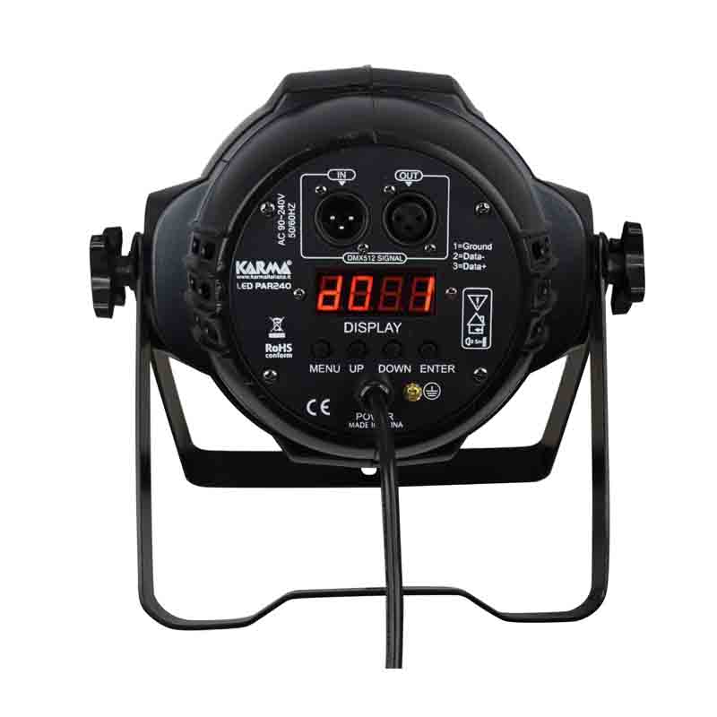 Destinato all’illuminazione di ampie superfici. Dispone infatti di ben 24 led da 10W con lenti ad ampia apertura(40°). I led sono di tipo quad e possono illuminarsi in ogni combinazione dei quattro colori base gestiti (RGBW). Opera in automatico, in manuale(colori impostabili a piacimento) o collegato ad impianti professionali DMX.