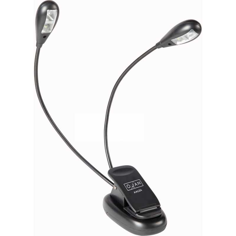 Morsetto flessibile con doppia lampada. 4 LED. Possibilità di utilizzare in modalità di risparmio energetico. Braccio flessibile. Design leggero e compatto. Ricarica tramite USB o batterie (3 x AAA). Cavo USB e batterie incluse.