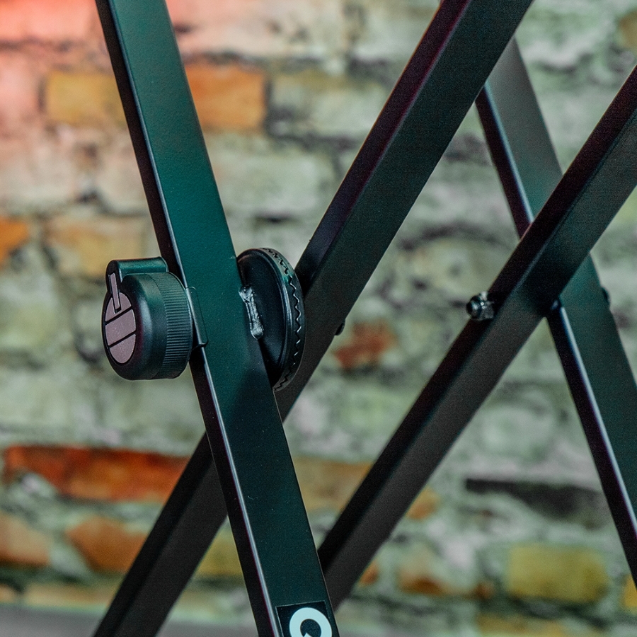 Al centro del supporto c’è il sistema di bloccaggio e regolazione “Dino-Bite”, scelto perchè facile da usare, elegante e anti-scivolo, permette di effettuare le regolazioni allentandolo e spostandosi su uno dei 9 livelli di altezza, per poi riavvitare il blocco centrale.Dotato di piedini e pad poggia-tastiera in gomma autolivellanti per compensare le irregolarità dei pavimenti o tastiere ed ottenere una migliore stabilità.